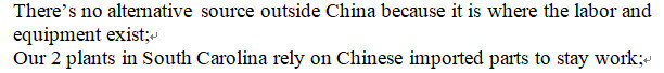 一路看下来,20日和21日的听证会透露出一个重要信息,那就是在很多美国厂商眼里,中国产品具有不可替代性。有12家企业表示只有中国才能生产他们的产品。